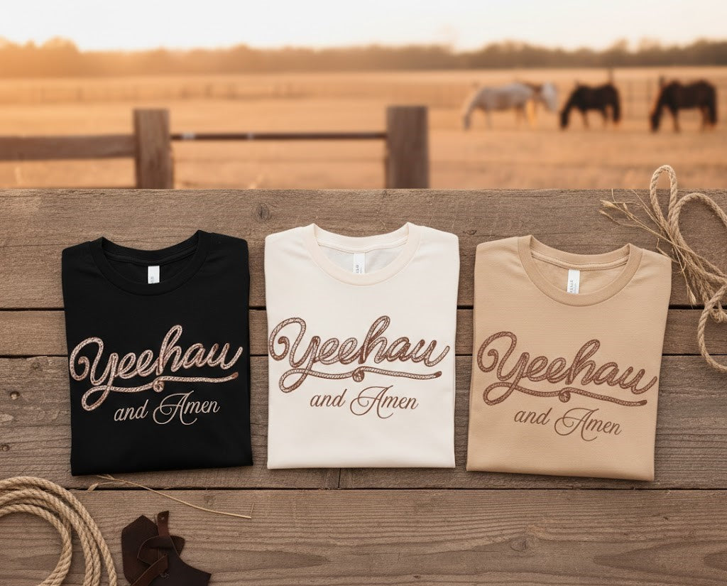 Whether you’re heading to a Sunday service or a Saturday rodeo, our "Yeehaw and Amen" tee is the perfect blend of country spirit and effortless style. Featuring a unique western rope-style script, this design is for the woman who lives by the ranch and loves with a grateful heart.